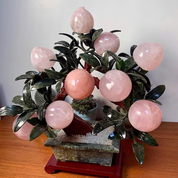 • Chất liệu: Quả đào thạch anh hồng, lá và chậu làm từ đá Serpentine.