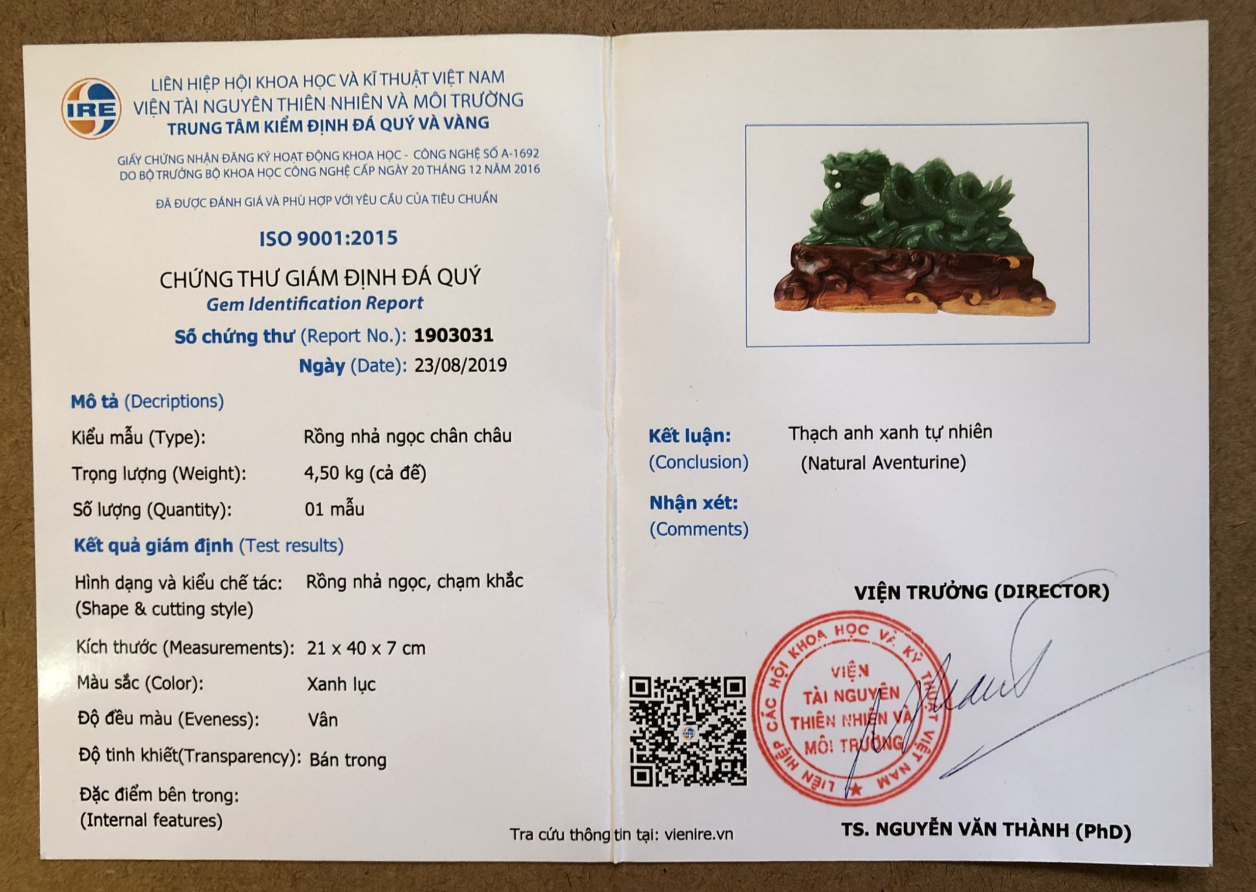 Tượng Rồng nhả ngọc nhận được giấy chứng nhận về chất lượng